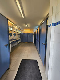 Grijswater afvoerput en spoelplaats voor chemisch toilet zijn aanwezig naast het sanitair gebouw